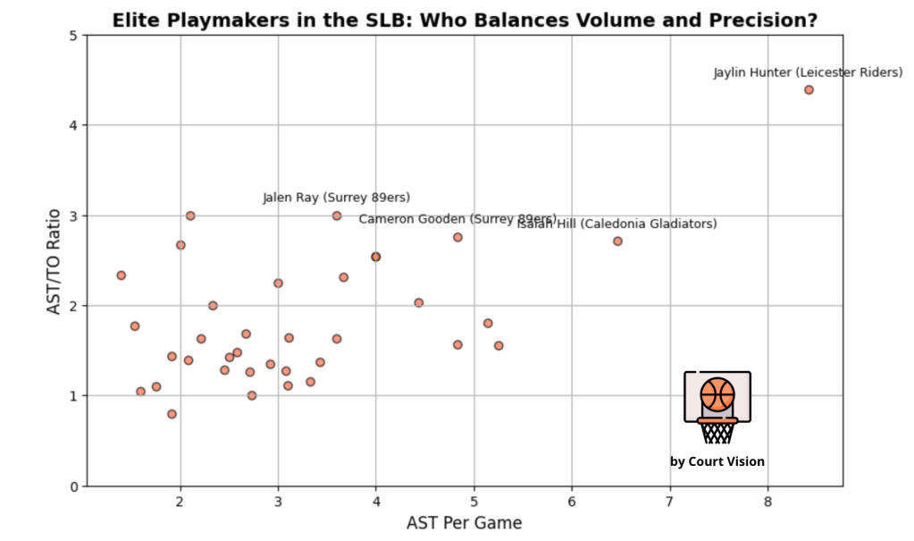 *Andrew Lawrence of the Surrey 89ers didn’t meet the 20-assist cutoff for the chart due to limited games played following his return from injury. Despite this, Lawrence’s current 9.50 assist-to-turnover ratio is remarkable, achieved while averaging 3.80 assists per game. Still, Hunter’s ability to combine high volume with control remains unparalleled in the league.