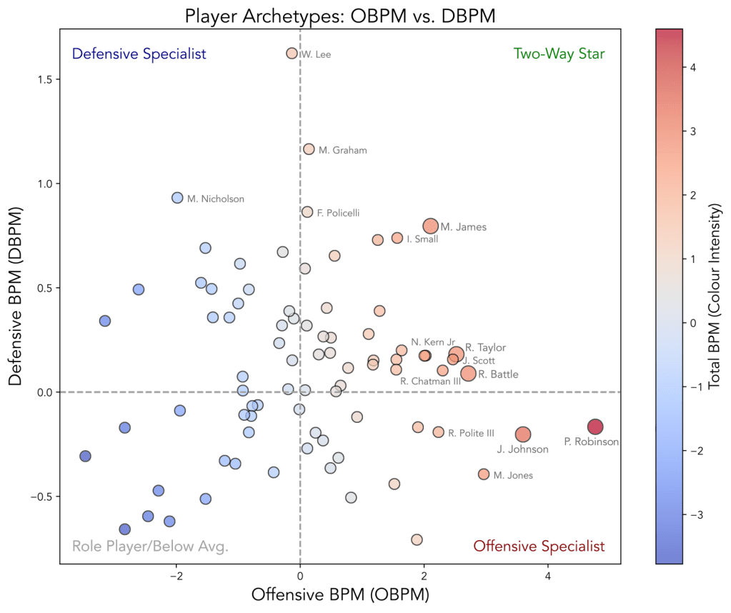 - Each BPM is calculated relative to the league average, meaning positive values are better than average, negative are lower than the average player.